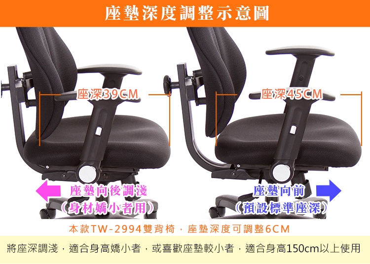 本款TW-2994坐墊可調整坐墊深度,能向後縮短座深6cm間距,實座深度45CM,可縮淺至39CM,適合身高150~185CM以 下,縮短座深讓身材嬌小使用上更加舒適,或是給喜好短座深的使用者(適合短腿族群的座椅)。