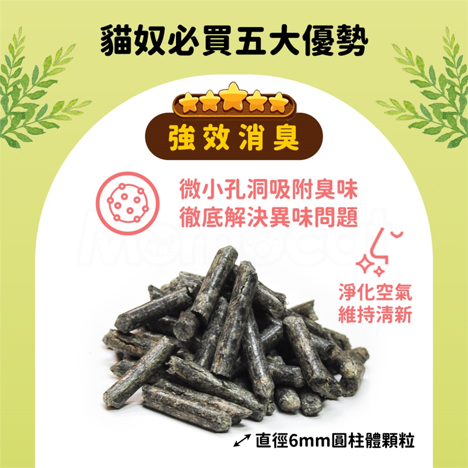 - 用量超省:結實圓柱狀,遇尿後多次分解,1包貓砂1隻貓約可使用6~8週,5隻貓約可使用2~3週。極低粉塵,貓掌不易夾砂帶出。