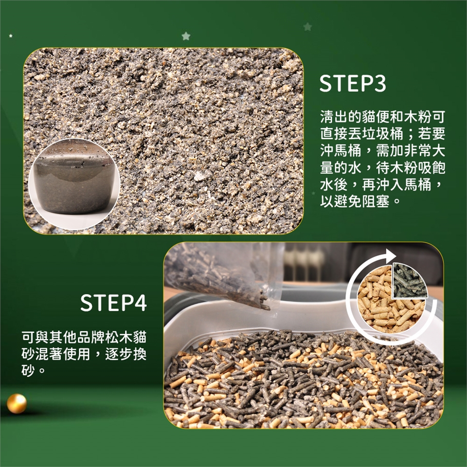 - 若想減少垃圾量,貓便、下層木粉需先倒入水中吸飽水後,再沖入馬桶。不建議直接大量倒入馬桶,可能會造成阻塞。