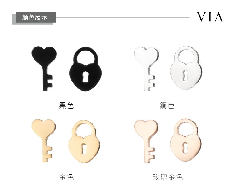 【VIA】時尚系列 愛心鎖孔鑰匙造型白鋼耳釘 造型耳釘 黑色