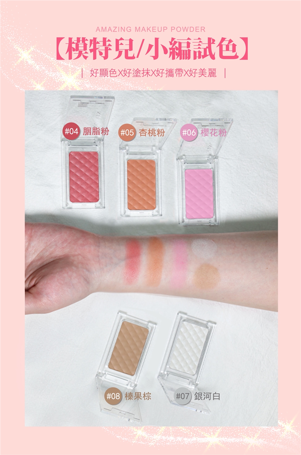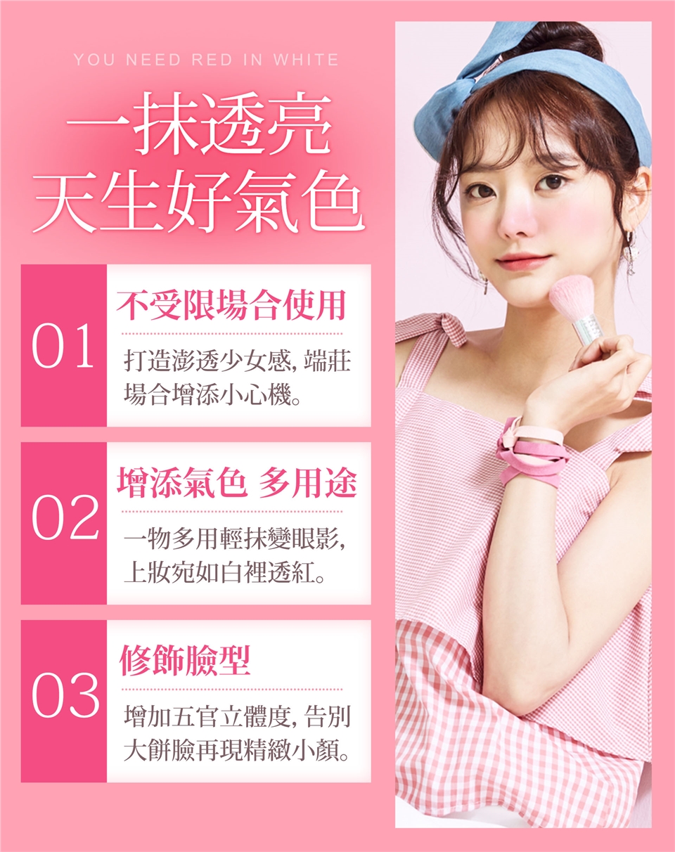 商品詳細介紹 體驗說明 不可體驗 使用方法說明 腮紅刷沾取適量輕輕掃在臉頰或刷在欲修飾處。 注意事項 避免本產品直接接觸眼睛,如不慎進入眼睛,請立即以清水徹底沖洗,如發現皮膚有任何不適或過敏,請立即停止使用,勿讓兒童接觸,不可進食,只供外用。