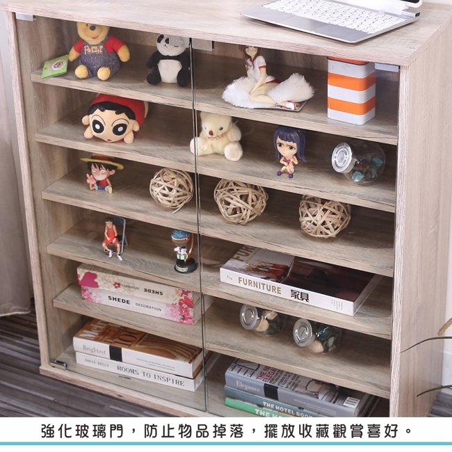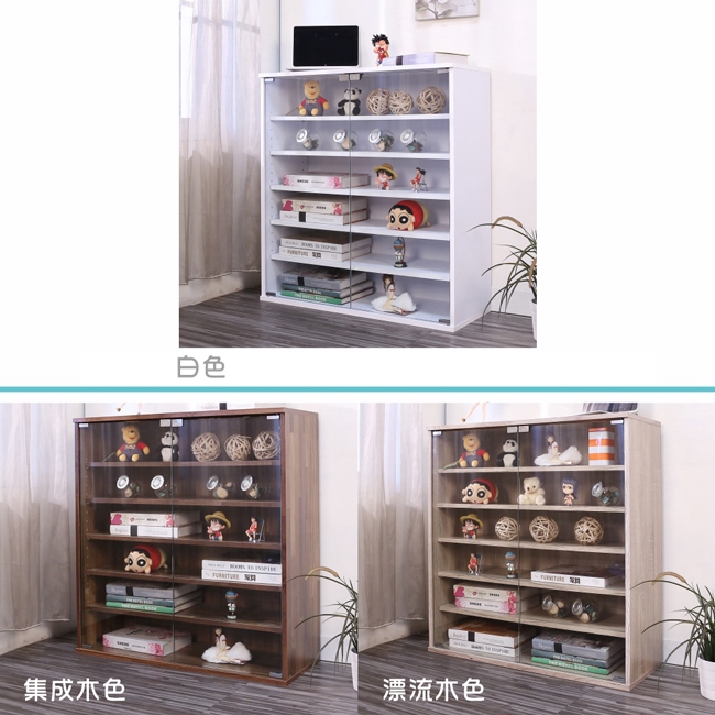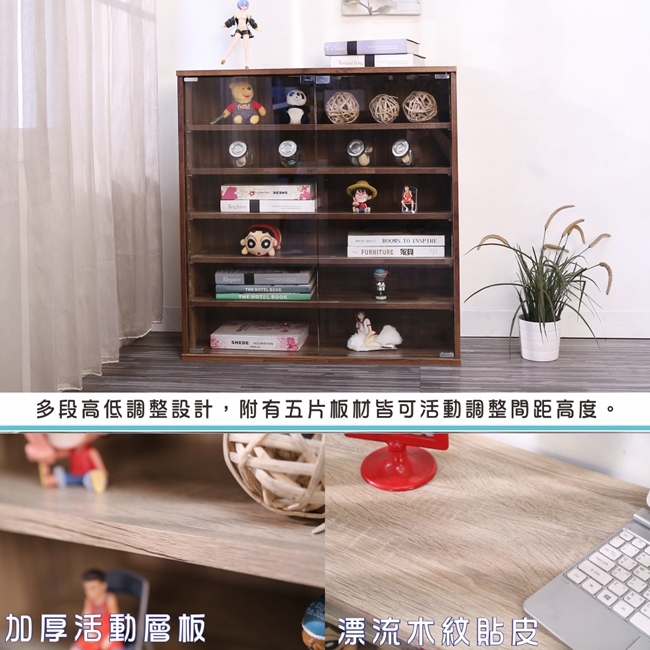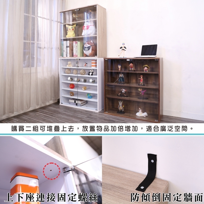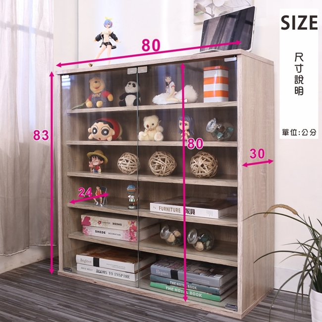 讓公仔們有個家吧!放到展示櫃裡擺放觀賞,朋友來時可以一同分享收藏,同時也可以裝飾家中的角落,全高83cm讓您完美呈現收藏品,5片活動層版可自由調整讓擺放不受限。讓小家庭可以輕鬆收納又不佔空間,此外整體板材使用低甲醛E1健康板材,讓您用的安心。不只可以放玩具公仔模型也可以當書櫃用或放小朋友的娃娃,如此多功能的櫃子,是家中不可或缺的好物。
