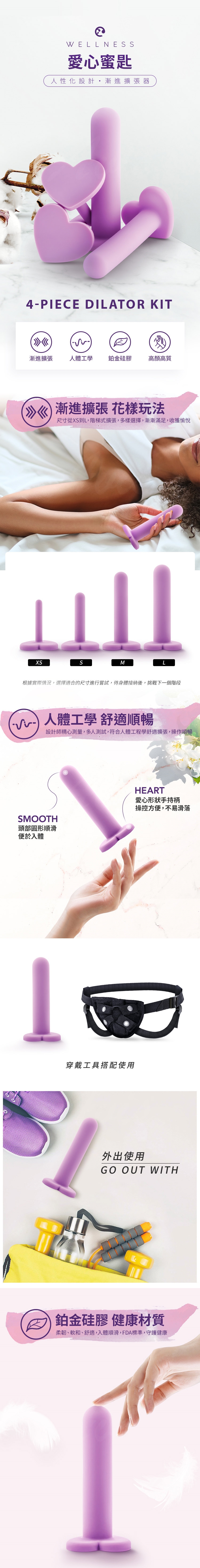 產品操作說明:愛心蜜匙【漸進式擴張器】套裝,精心打造,讓您倍感舒適。這個 4 件套套件中的每個陰道、肛門擴張器都具有絲般光滑、柔軟的矽膠和圓形尖端,可避免宮頸刺激和肛門刺激。