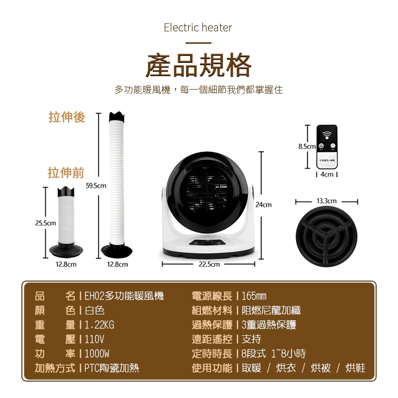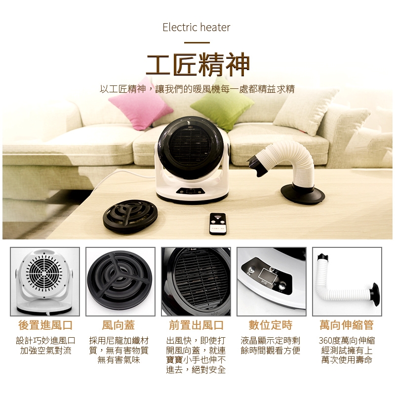 〞暖風扇x1 / 萬向風蓋x1 / 萬向伸縮管x1 / 遙控器x1 / 說明書x1