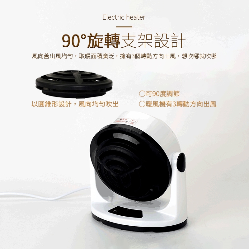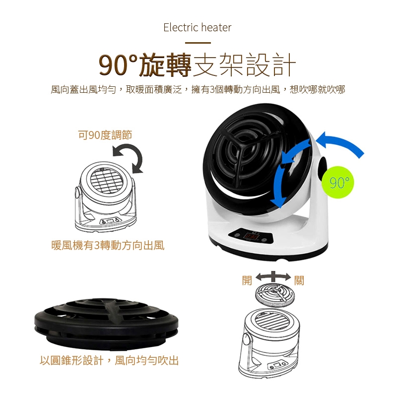 90度旋轉支架 / 圓錐形萬向風蓋設計,出風均勻,取暖面積廣