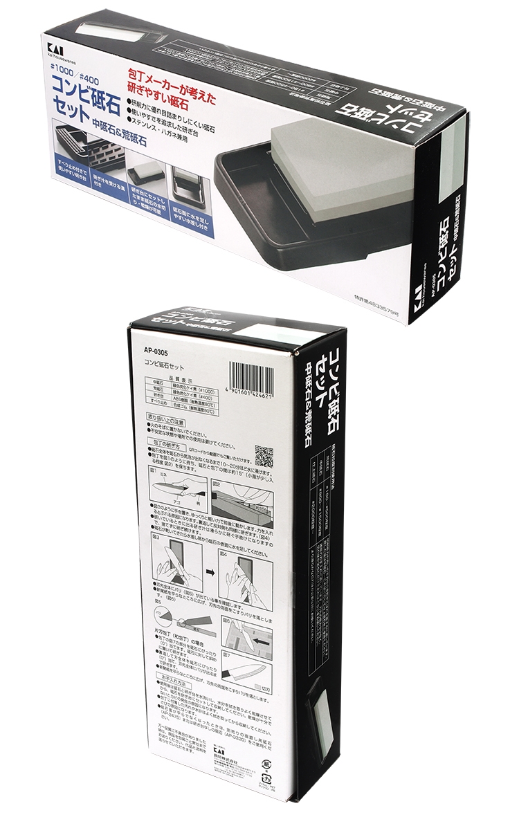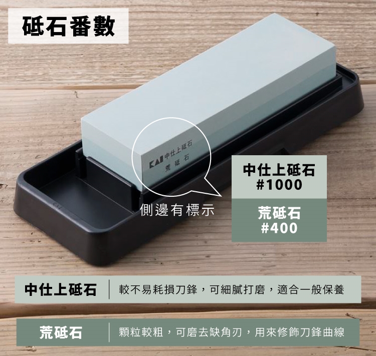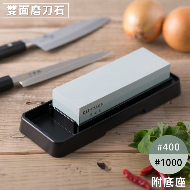 ●【品名】日本KAI貝印雙面金鋼砂磨刀石附台座AP-0305(荒砥石#400番/中砥石#1000番)碳化矽磨刀器 適單刃雙刃出刃柳刃三德刀菜刀包丁