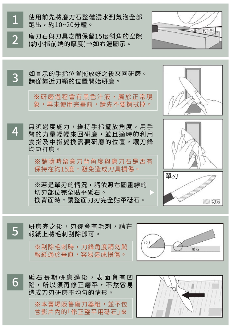※請隨時留意刀背與磨刀石是否有保持在約15度,避免造成刀具損傷。