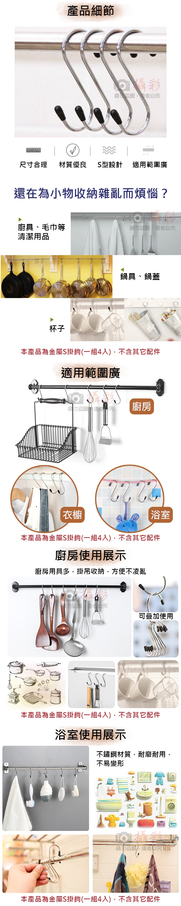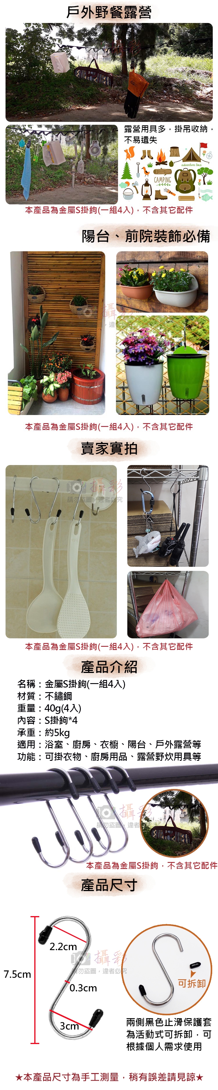 功能:可掛衣物、廚房用品、露營野炊用具、椅背勾、曬衣架、鞋架等