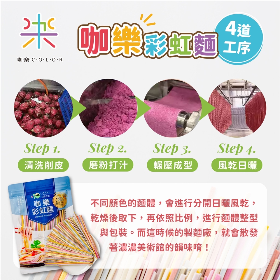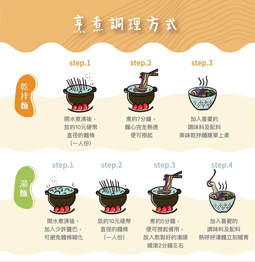 麵條有蔬果榨汁製成,故麵條上黑點是蔬果果籽或果皮及纖維的呈現,乃屬正常現象,非發霉 ,可安心食用。