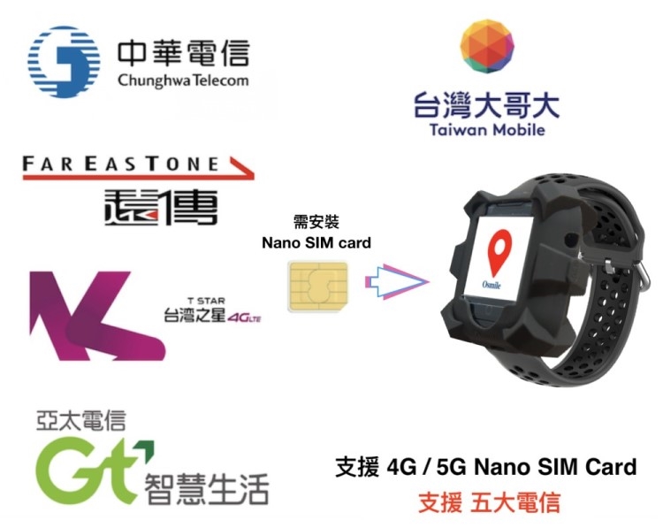 購買 Osmile ED1000 工安關懷系統定位手錶後,可至中華電信、台灣大哥大、遠傳、亞太、台灣之星購買(4G / 5G) Nano SIM Card 安裝後即可使用