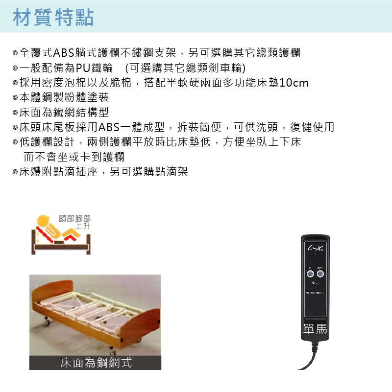 ◎床頭床尾板採用ABS一體成型,拆裝簡便,可供洗頭,復健使用