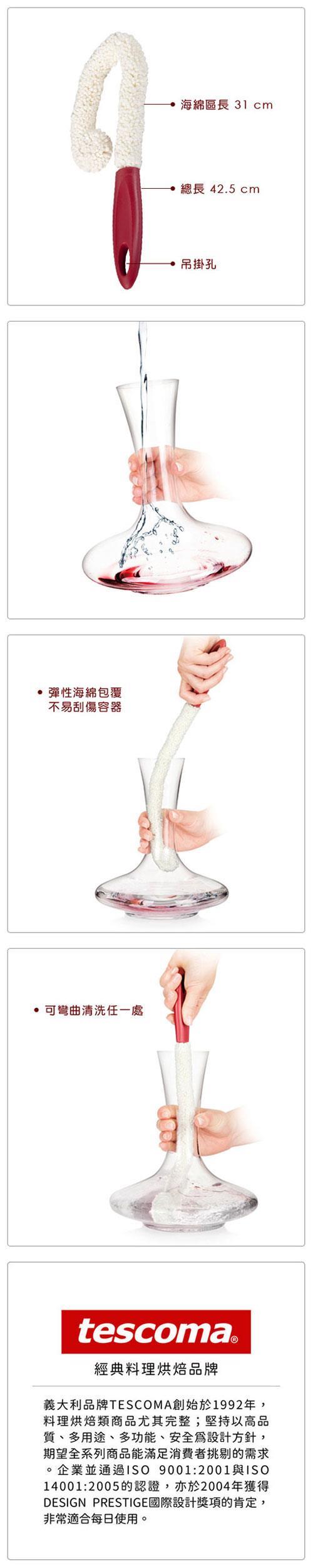 享用紅酒後,醒酒瓶需要好好清潔一番,避免殘留酒漬。此款清潔刷以彈性海綿包覆,不易刮傷容器表面;可依容器角度彎折,輕鬆清潔瓶中的每一角落。亦可清洗各式酒杯、水壺等;可吊掛收納省空間。