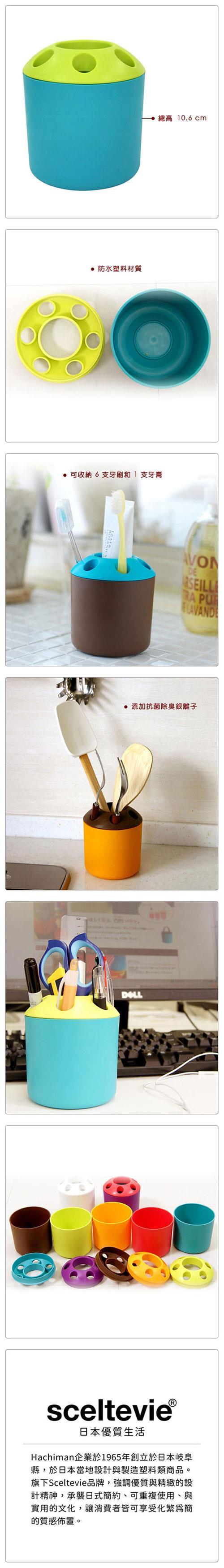 本商品一件入、可收納牙刷 x 6、牙膏 x 1。添加抗菌除臭銀離子。防水的塑料材質,方便收納於高溫潮濕的浴室、廚房等空間。衛浴空間需要有效率的收納,才能減少雜亂感,此款牙刷架可收納全家人的牙刷、牙膏,簡約多彩的配色可融入各種居家裝潢,給您一致且清新的視覺;亦可作居家辦公收納文具的筆筒或廚房置放鏟匙收納架。