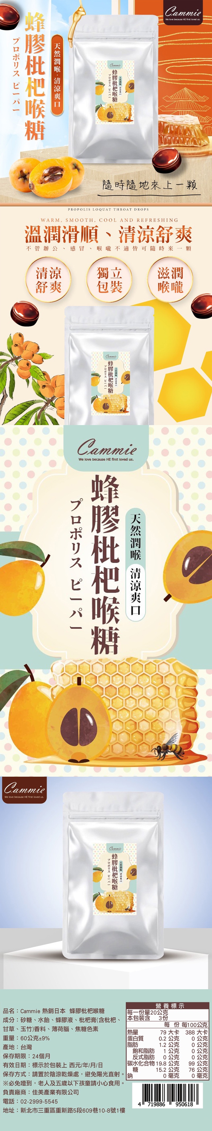 成份 : 砂糖、水飴、蜂膠液、枇杷膏(含枇杷、甘草、玉竹) 、香料、薄荷腦、焦糖色素
