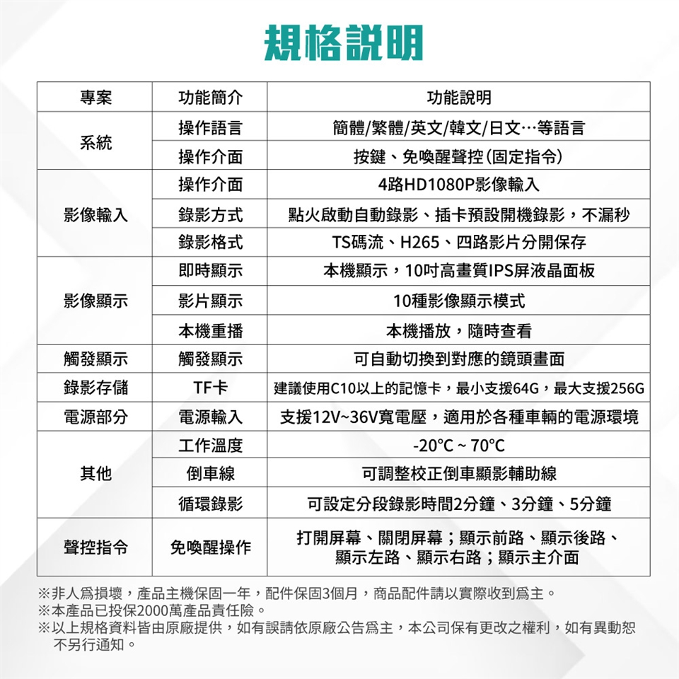 配件:10吋螢幕主機 / 主機架 / 無光紅外線防水鏡頭*4 / 鏡頭延長線3米*3 / 後鏡頭延長線15米 / 遙控器 / 說明書(保卡)