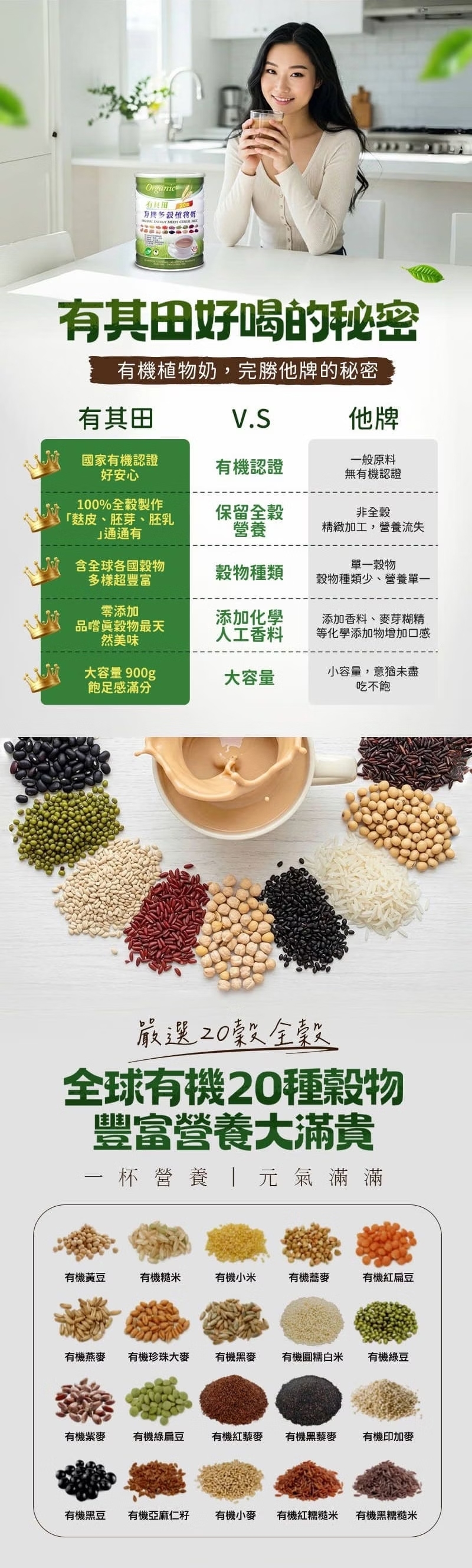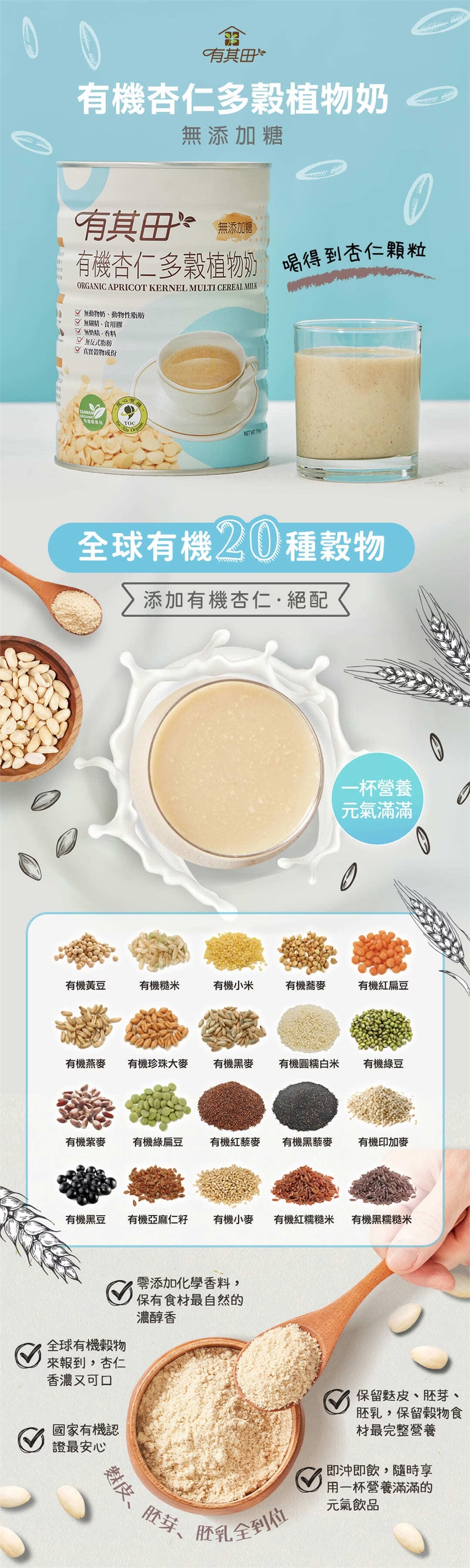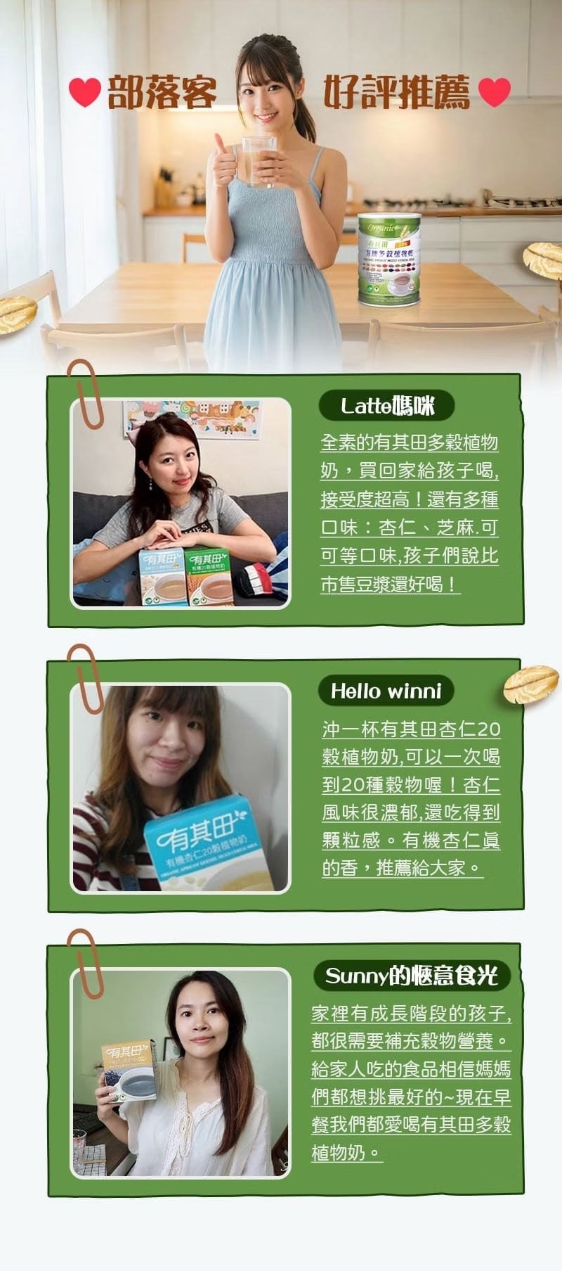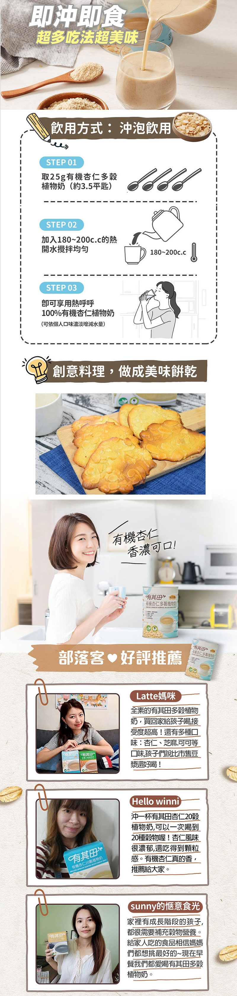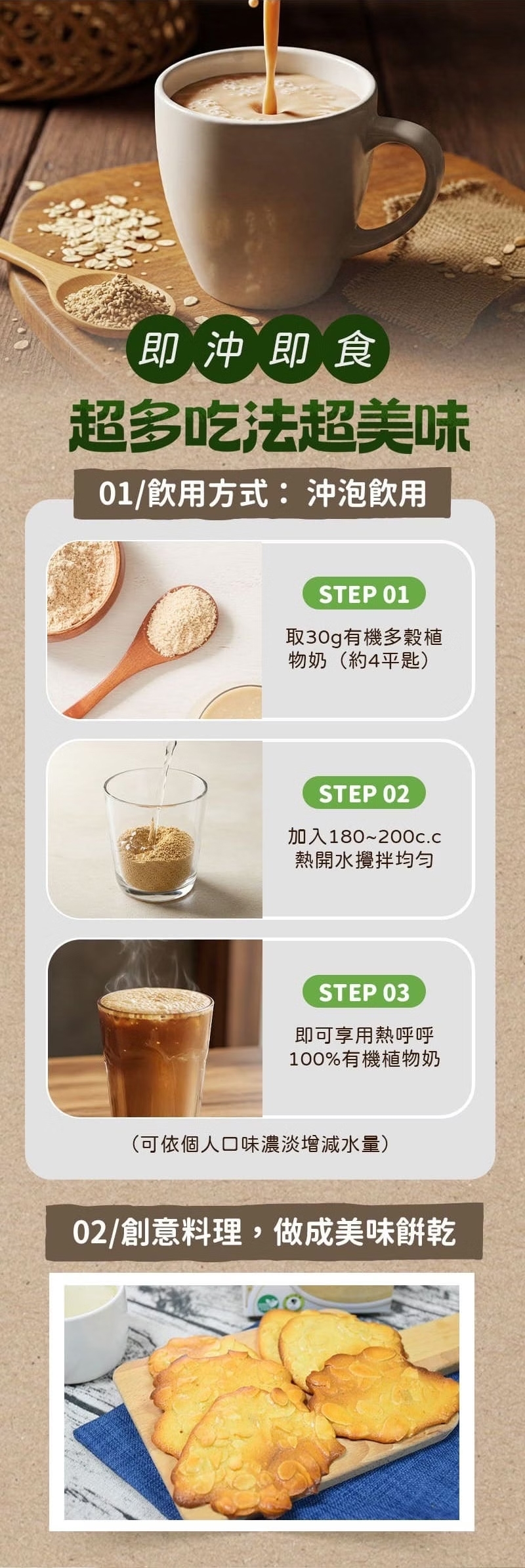 1.熱飲)將30g有其田多穀植物奶加入180~200c.c.的熱開水攪拌均勻,即可享用100%濃、純、無添加的有 機植物奶。