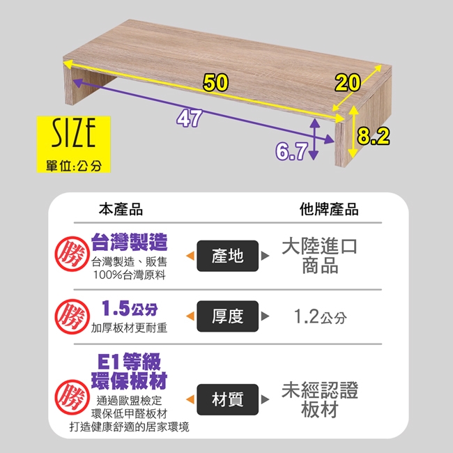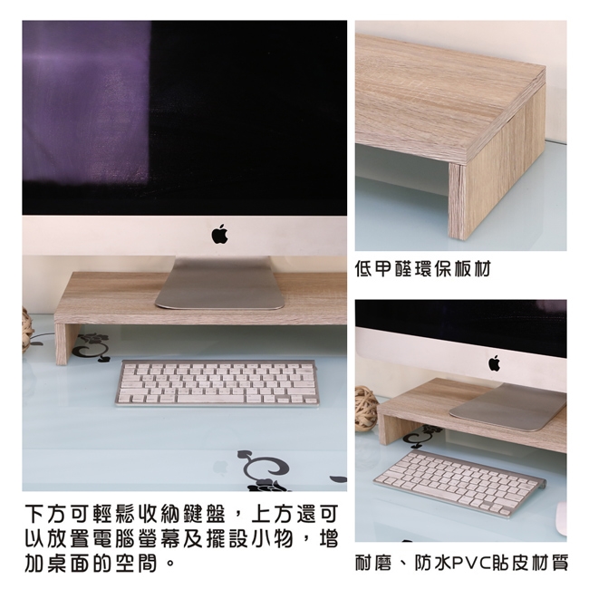 此款是特別針對小桌面,高工作量所設計出的收納架,專屬桌上收納空間,讓您以有限的空間,做最有規劃的收納。收納架有8公分高的空間及深度20公分,可放置在電腦桌上當螢幕架或是印表機架,下層的空間可擺放鍵盤、檔案文件、文具用品及其他小物;擺在廚房裡可以將烤麵包機、熱水壺或是電鍋擺在收納架上,下面空間可放碗盤或調味料。無論搭配平面電腦桌,工作桌皆可搭配,實用性超高,經濟又實惠,真的是一舉兩得呢!板材更提升採用E1低甲醛板材,讓您的居家空間更加健康。