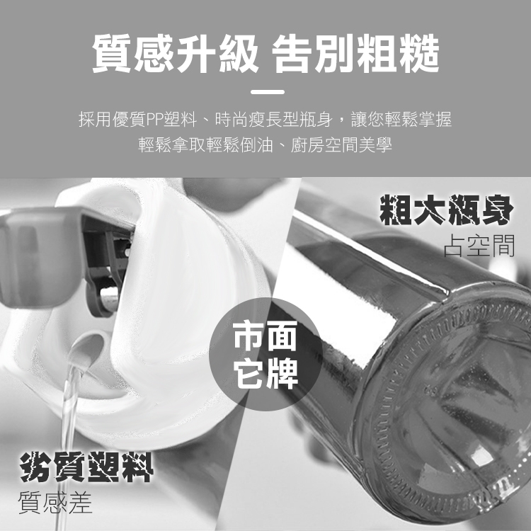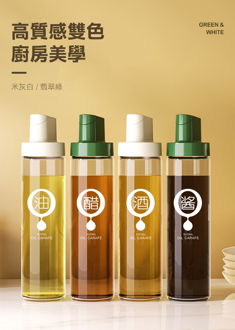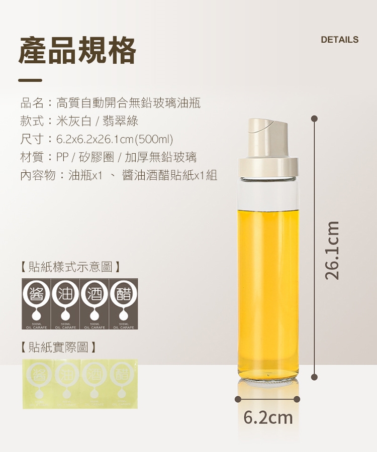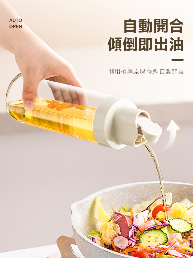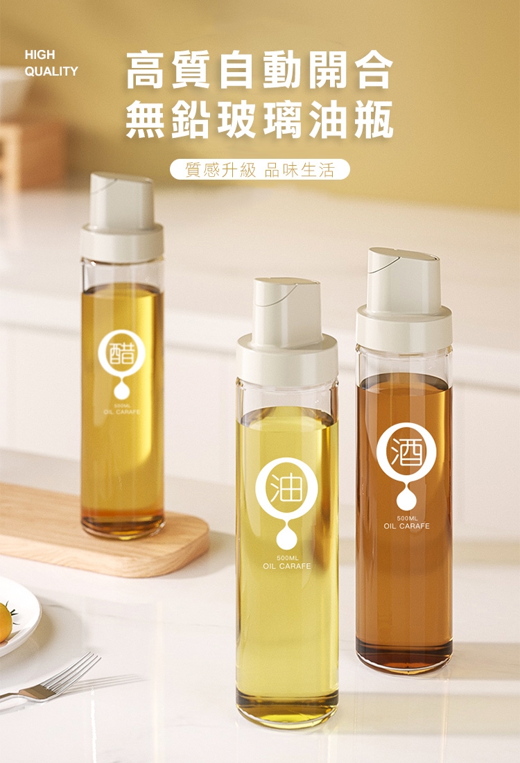 市面上油壺品質差嗎?出油卡卡?補充油困難?質感粗糙?全新升級高質自動開合無鉛玻璃油瓶,自動槓桿開合,簡約瓶身設計!改良喇叭型嘴口,俐落斷油不浪費;附贈高透調味標籤一組,讓您醬油酒醋不搞混;升級加厚無鉛玻璃,環保健康!大口徑好倒油!可拆式易清洗!是廚房必備的料理好幫手唷~