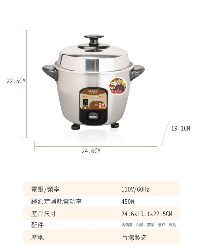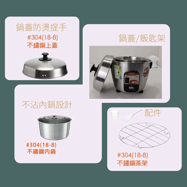 ◎全不鏽鋼電鍋,導熱性佳,健康無污染,食用安心