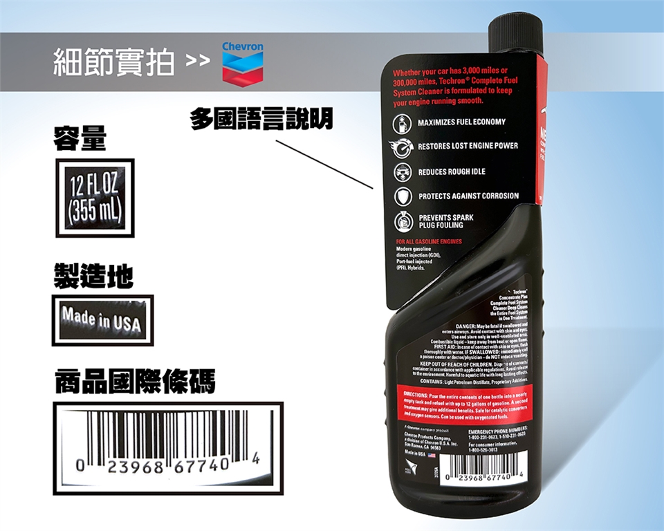 Chevron Techron Plus Fuel System Cleaner 是一款汽油引擎用的清潔劑,能夠全面清潔汽油噴射系統和化油器系統,包括活塞頭、進氣歧管、進氣閥、燃油噴嘴和燃油泵等部件,從而提高發動機性能,減少污垢、碳積和沉積物的堆積,減少排放,同時能保持燃油經濟性。除此之外還能夠保護引擎和燃油系統,提高燃油的燃燒效率,減少污垢和沉積物的產生,從而延長引擎壽命,降低維修費用。使用的頻率為每3,000英里(4,800公里)或定期更換機油的間隔,不超過每次更換機油兩次。