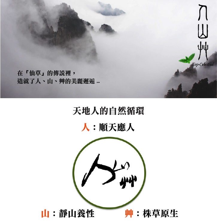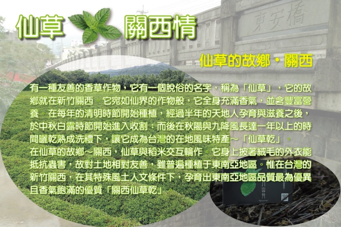 有一種友善的香草作物,它有一個脫俗的名字,稱為「仙草」。宛如仙界的作物般,它全身充滿香氣,並富含豐富營養。在每年的清明前後開始扦插種植,經過半年的天地人孕育與滋養之後,於最肥美與締結花苞準備繁衍的時節(白露),開始進入收割;而後在秋陽以及九降風洗禮之下,再經長達1年以上的時間熟成孕化,終究熟成為台灣的在地風味特產-「仙草乾」。