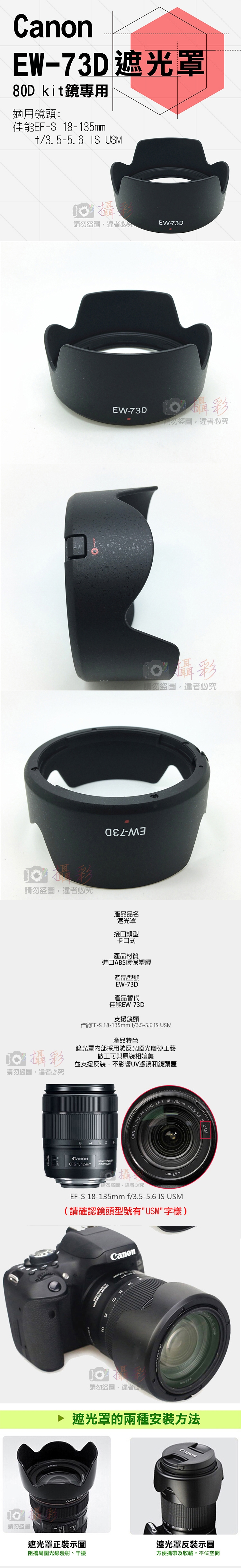 備註:佳能 80D相機kit鏡。舊款的Canon EF-S 18-135mm F3.5-5.6 IS STM不適用,舊款請選購賣場內的EW-73B遮光罩