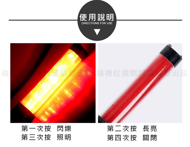 使用模式:按第一下閃爍、按第二下常亮、按第三下手電、按第四下關閉