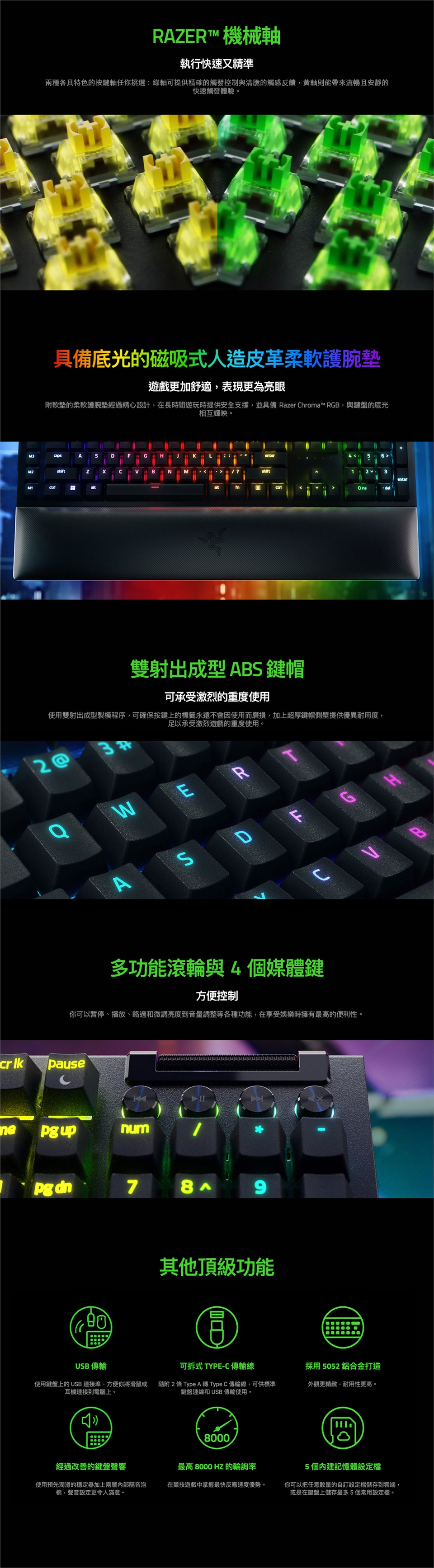 附軟墊的柔軟護腕墊經過精心設計,在長時間遊玩時提供安全支撐,並具備 Razer Chroma™ RGB,與鍵盤的底光相互輝映。