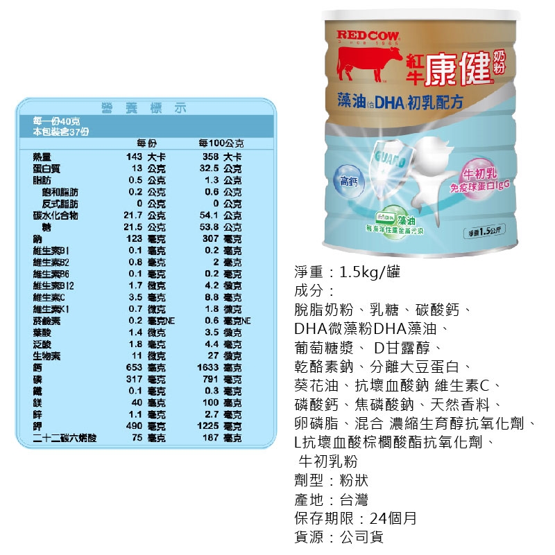 成分:脫脂奶粉、乳糖、碳酸鈣、DHA微藻粉DHA藻油、葡萄糖漿、 D甘露醇、乾酪素鈉、分離大豆蛋白、葵花油、抗壞血酸鈉 維生素C、磷酸鈣、焦磷酸鈉、天然香料、卵磷脂、混合 濃縮生育醇抗氧化劑、L抗壞血酸棕櫚酸酯抗氧化劑、 牛初乳粉