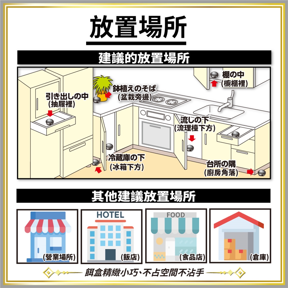 ●擺放時,請放在孩童及寵物不易觸及之處;亦請不要使餌劑碰到水。
