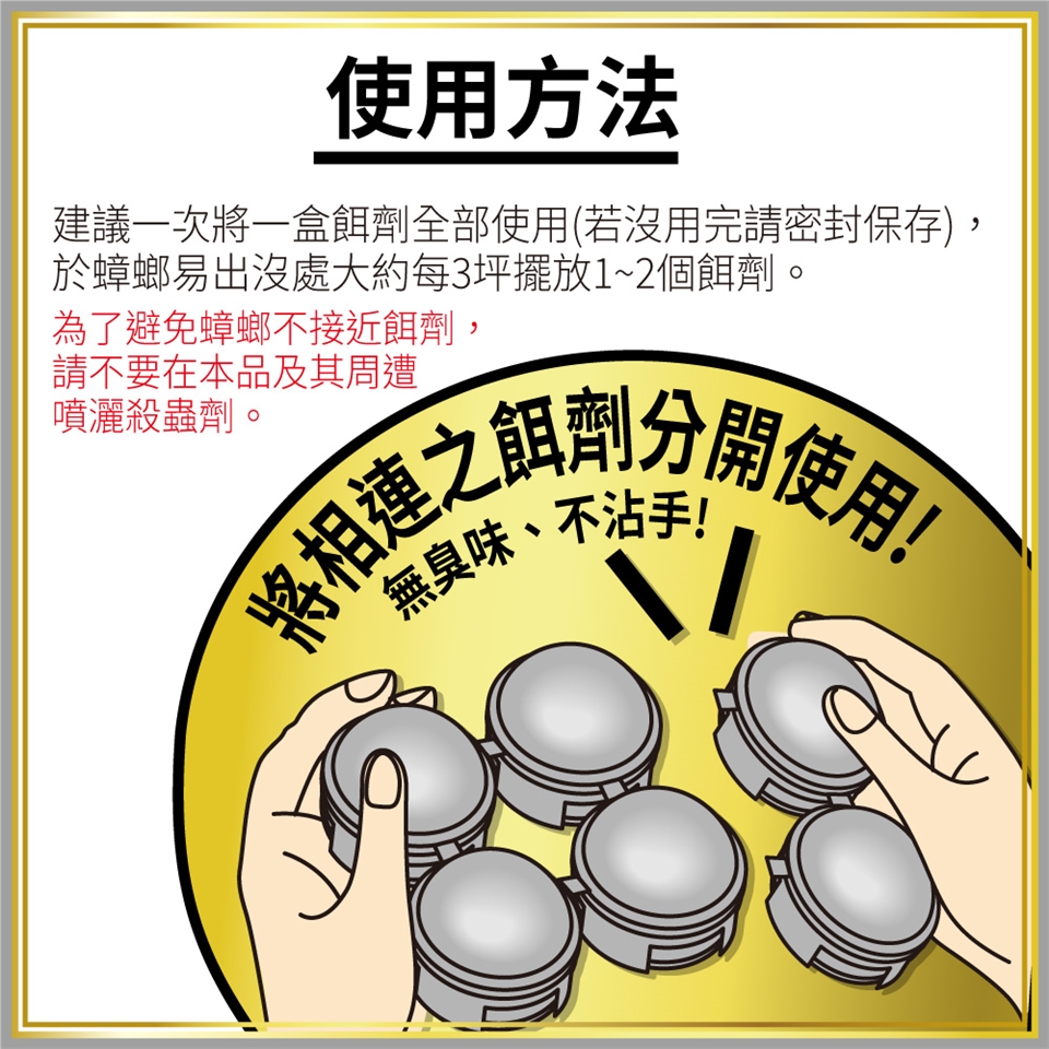 ●建議一次將一盒餌劑全部使用,於蟑螂易出沒處大約每3坪擺放1~2個餌劑。其他空間則依蟑螂出沒狀況自行斟酌用量。為了避免蟑螂不接近餌劑,請不要在本品及其周遭噴灑殺蟲劑。