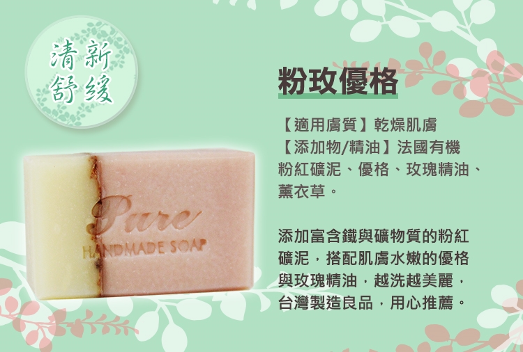主要成分:橄欖油、椰子油、棕櫚油、蓖麻油、法國粉紅礦泥、優格、玫瑰精油、玫瑰香精油、薰衣草乾燥花
