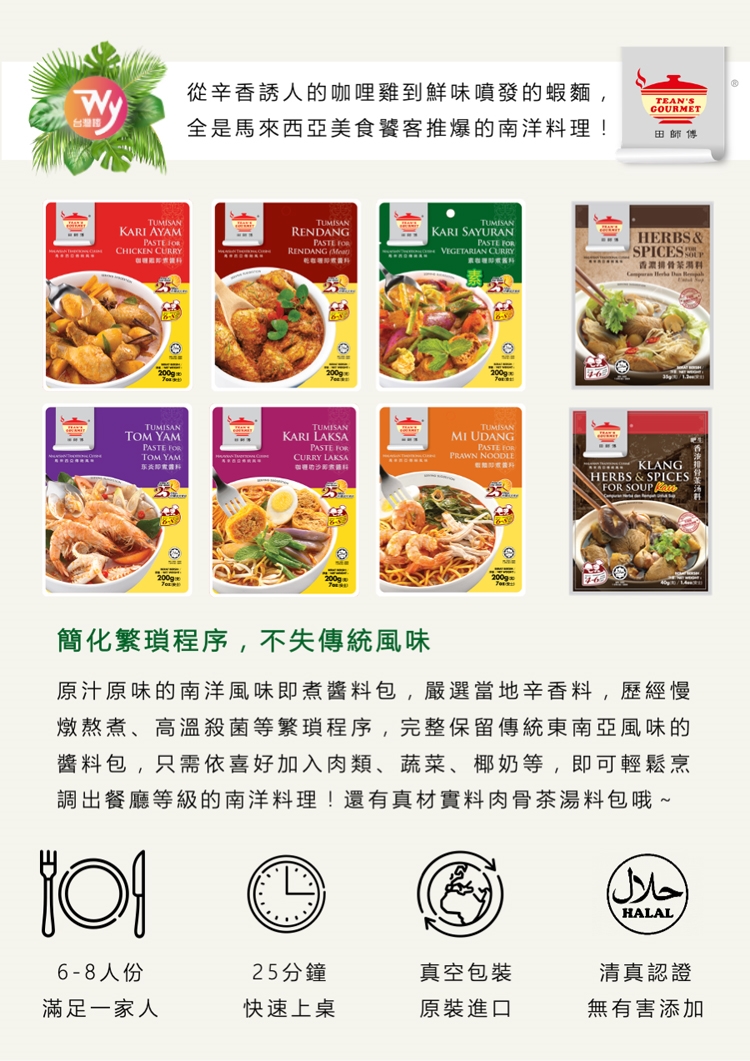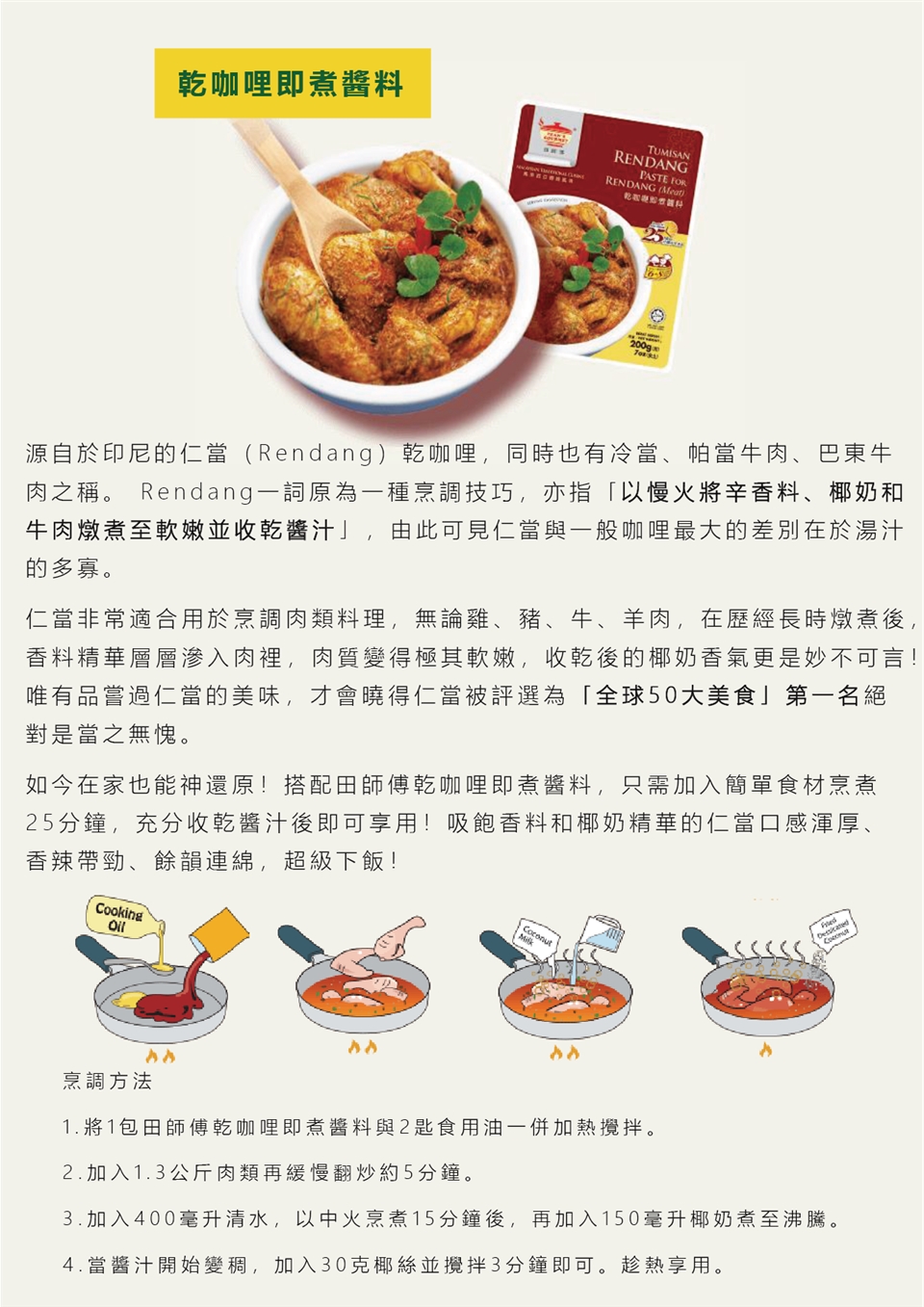 現在不用繁瑣備料,在家就能輕鬆完成:搭配《田師傅》仁當/巴東(乾咖哩)即煮醬料,放肉、加水、收汁,約 25 分鐘上桌;吸飽香料與椰奶精華的仁當,厚香帶勁、餘韻綿長、超級下飯