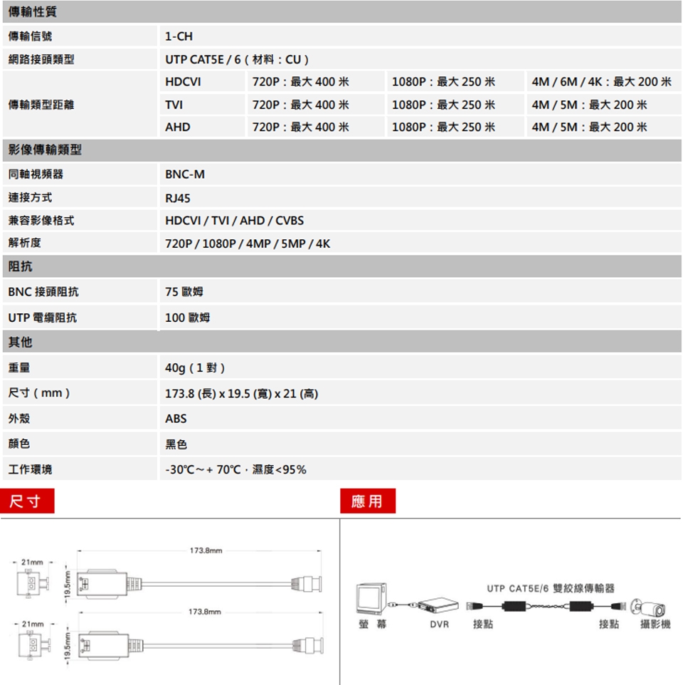 傳輸距離 720P (400m)、1080P (250m)、4MP / 5MP / 4K (200m)