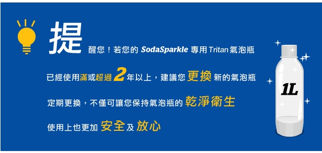8.提醒您,若瓶身使用滿2年或發現有刮痕、變形或變色,請立即更換新的氣泡瓶。不僅讓您的氣泡瓶乾淨衛生,使用上也更加安心。