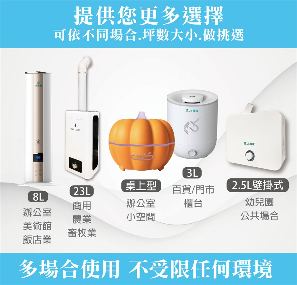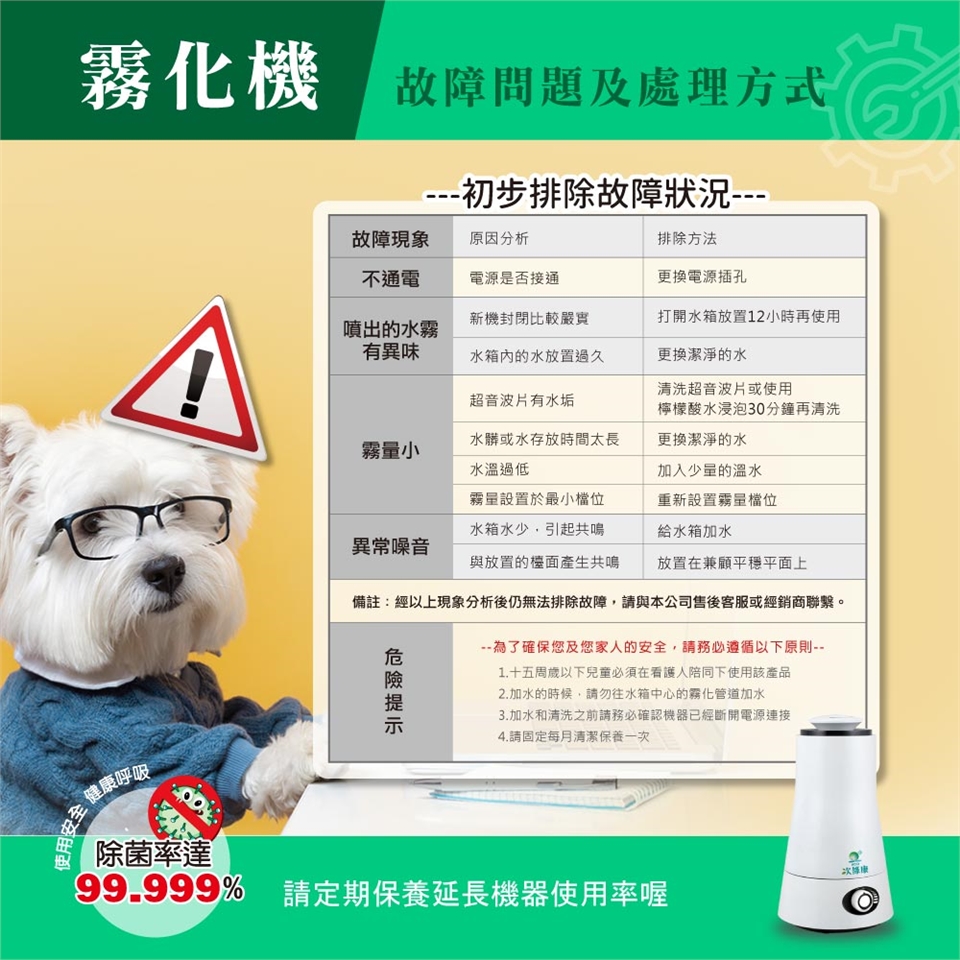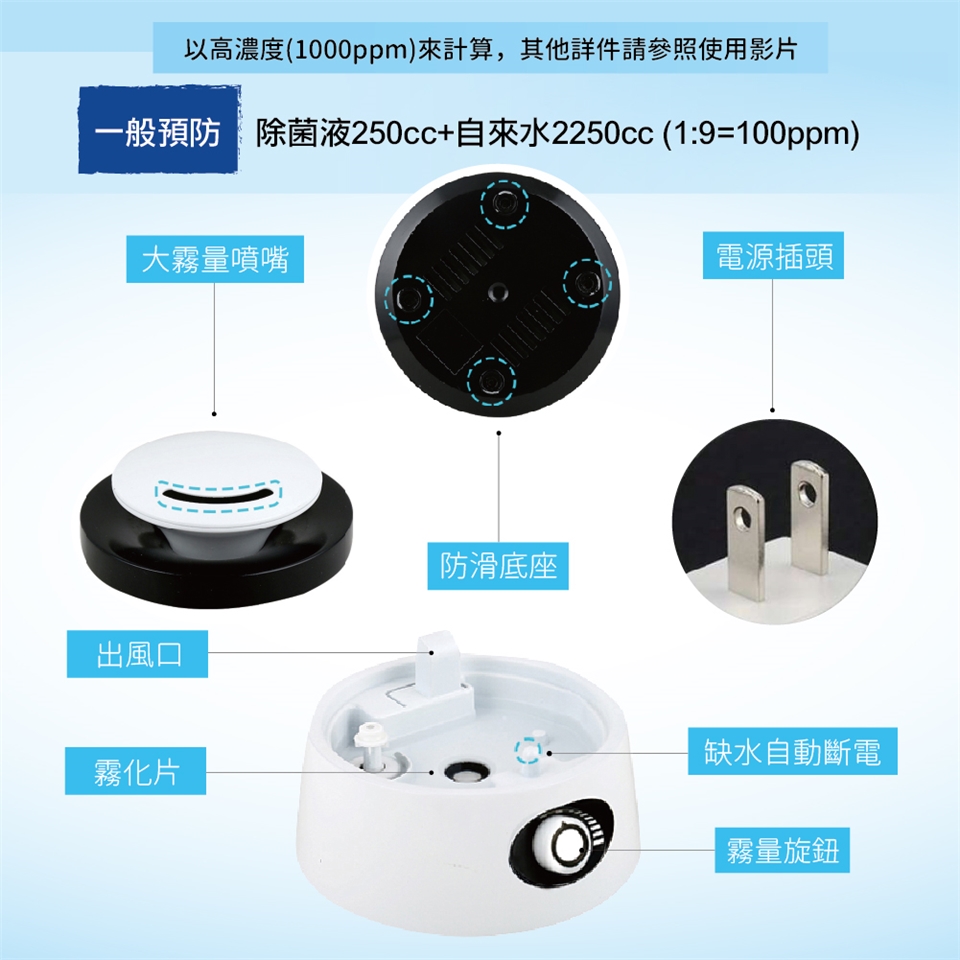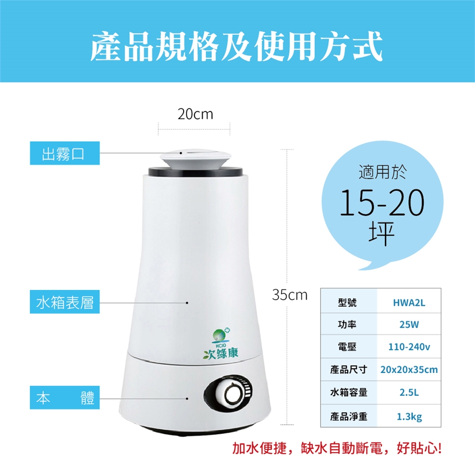 2.搭配次綠康除菌液加入儲水瓶,霧化機藉由高聲波轉化成細微的水分子散佈在空氣中。