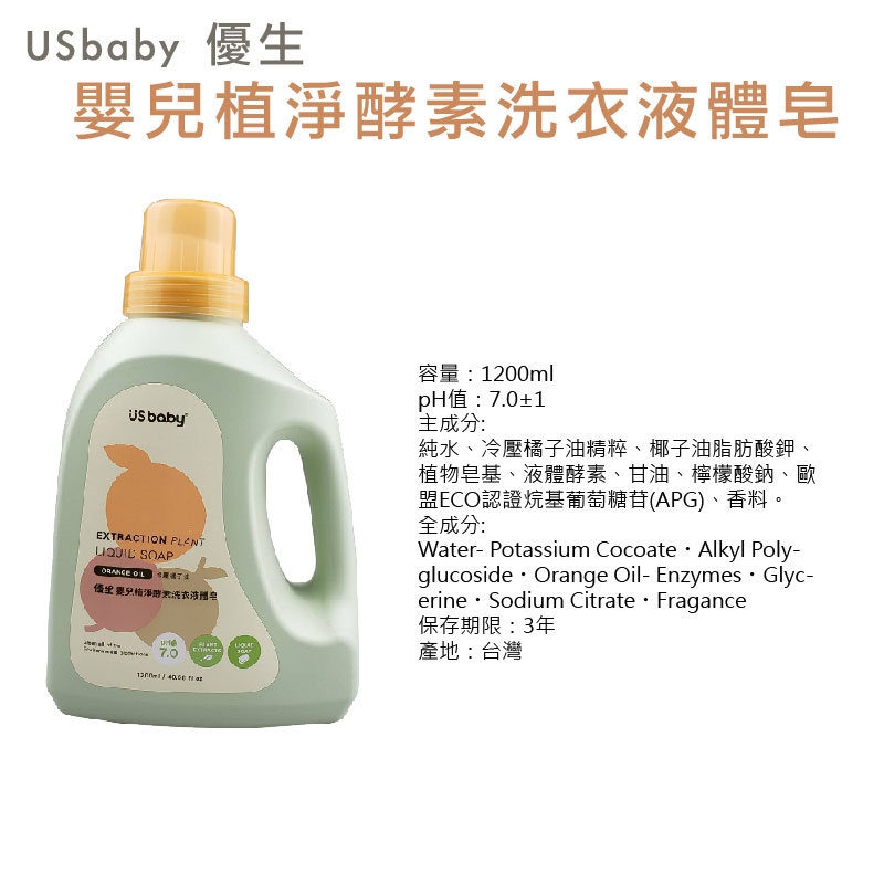 純水、冷壓橘子油精粹、椰子油脂肪酸鉀、植物皂基、液體酵素、甘油、檸檬酸鈉、歐盟ECO認證烷基葡萄糖苷(APG)、香料。