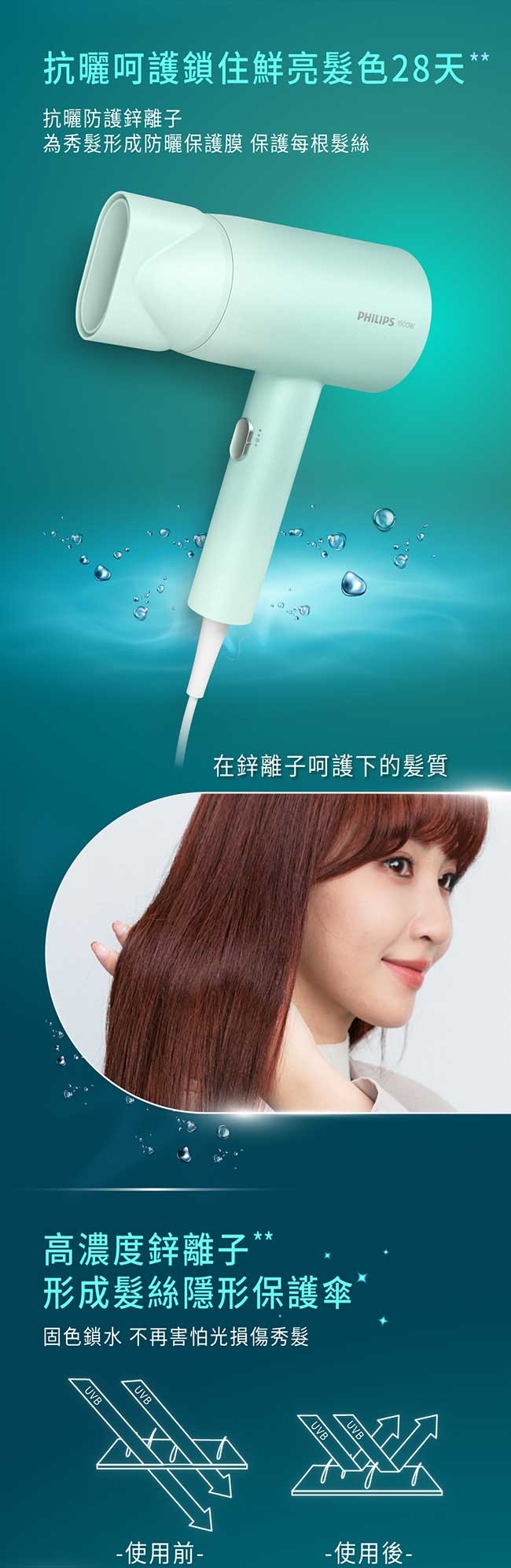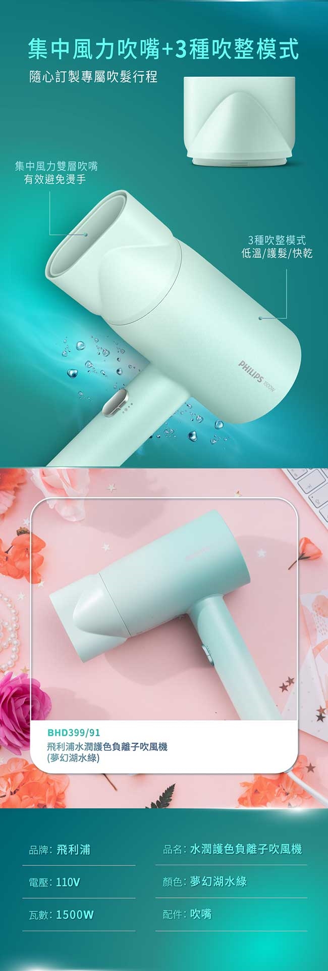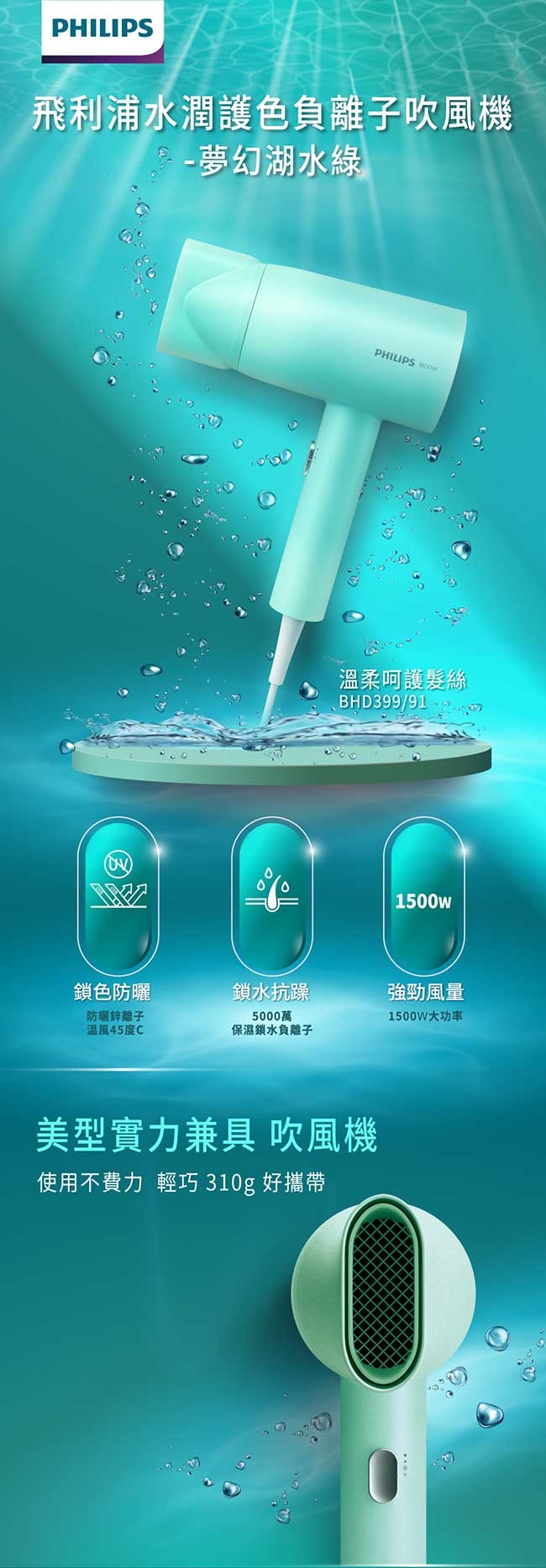 【Philips飛利浦】BHD399/91水潤護色負離子吹風機(夢幻湖水綠)