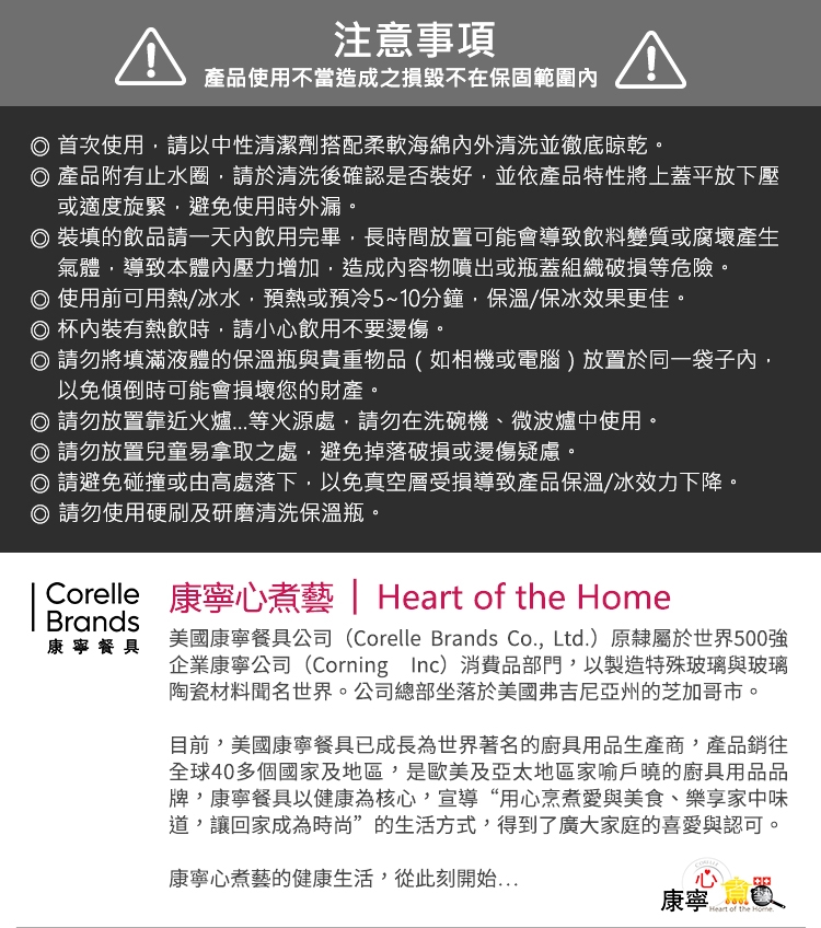 ◎請避免碰撞或由高處落下,以免真空層受損導致產品保溫/冰效力下降。