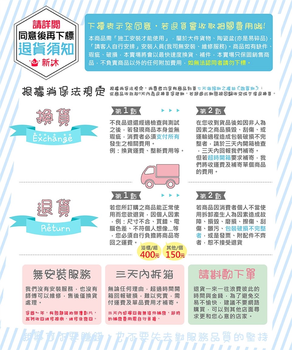 ※若出現商品瑕疵,請通知我們進行換貨,但換貨的安裝費用、拆卸費用、水電費用,不在我們的服務範圍中。