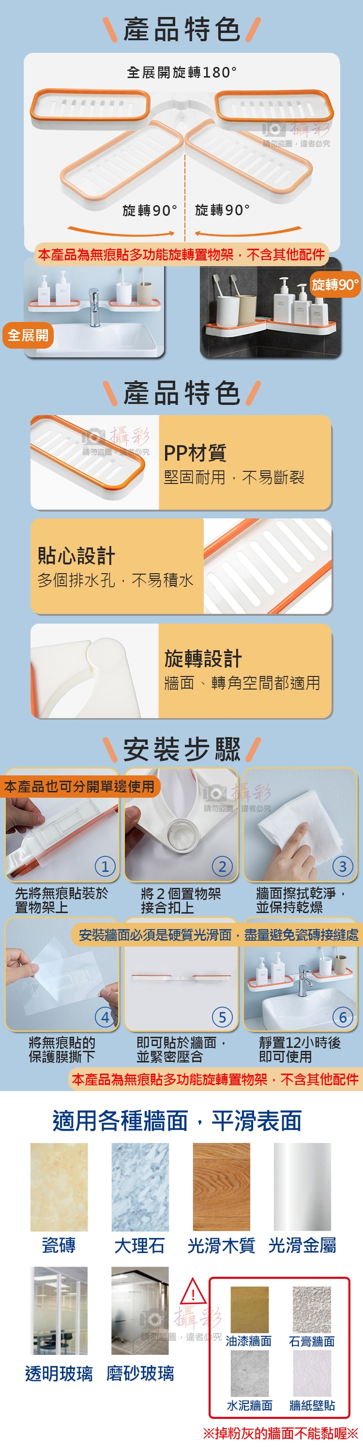 ●適合光滑牆面(平滑磁磚、玻璃表面、金屬材質、鏡面、光滑大理石),不適用於會掉粉灰的牆面。