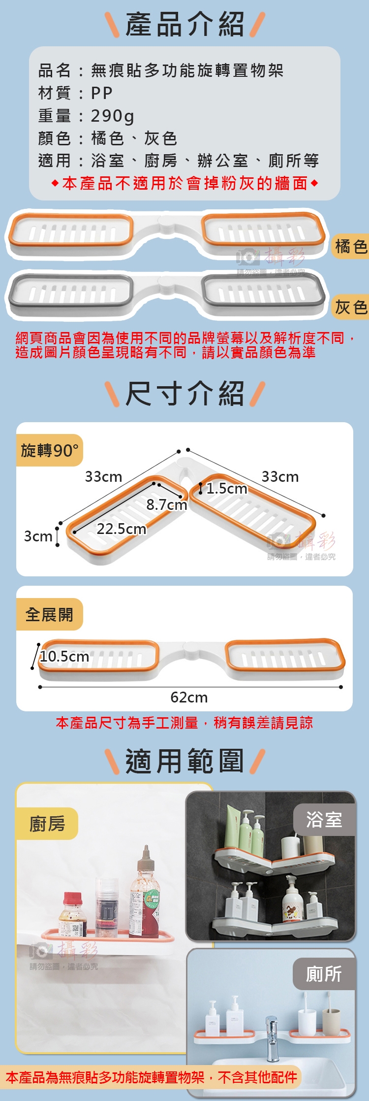 ★安裝牆面必須是乾淨無水漬的硬質光滑面(如瓷磚、玻璃、鏡子等)強力貼安裝的地方盡量避免瓷磚接縫處,並空置12小時後使用★