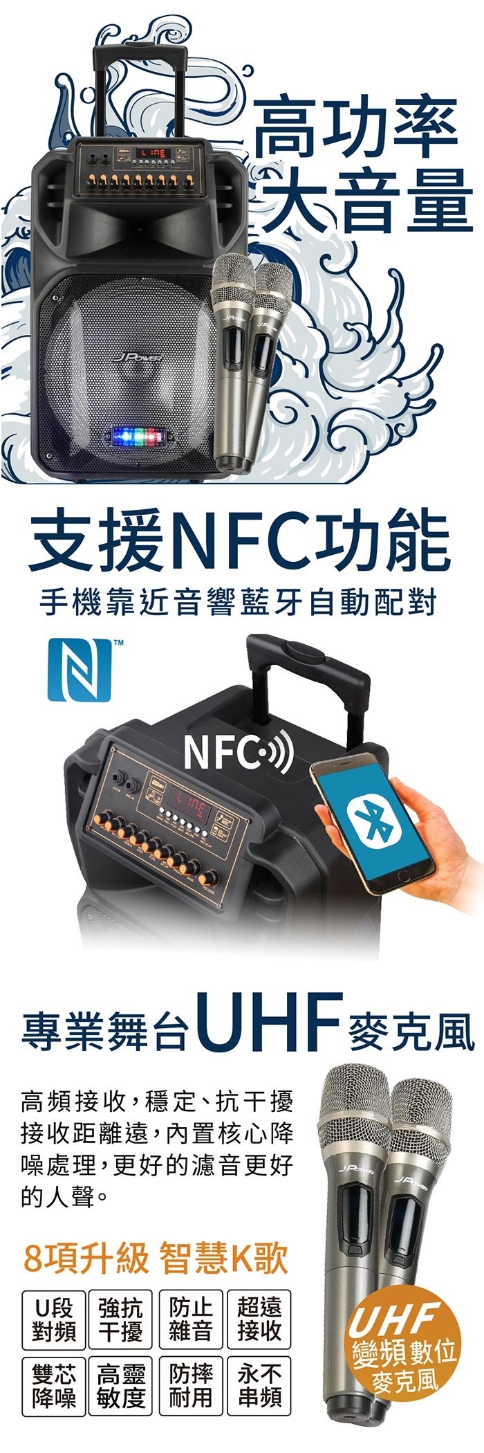 無線麥克風、AUX輸入、藍牙、NFC、帶電池、FM功能、讀卡USB、附遙控