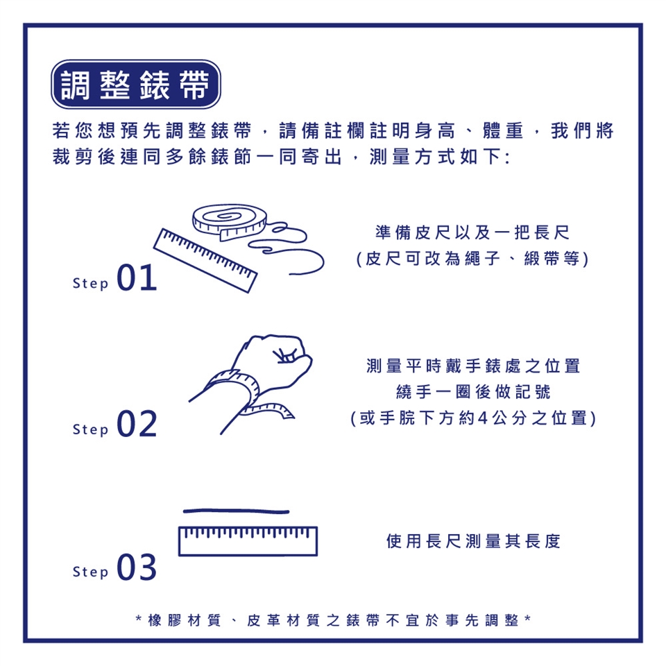 若您想預先調整錶帶,請備註欄註明身高、體重,我們將裁剪後連同多餘錶節一同寄出,測量方式如下-