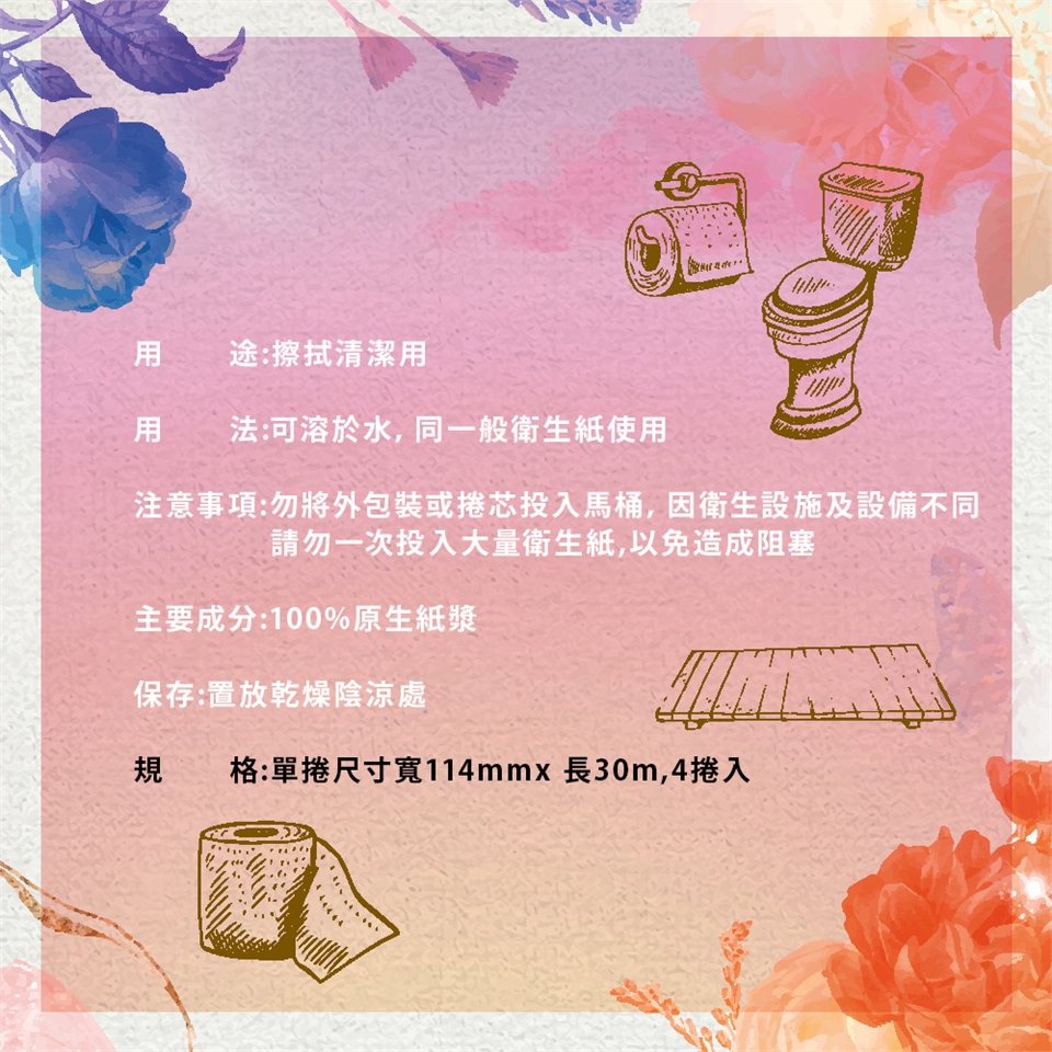 注意事項:勿將外包裝或捲芯投入馬桶,因衛生設施及設備不同