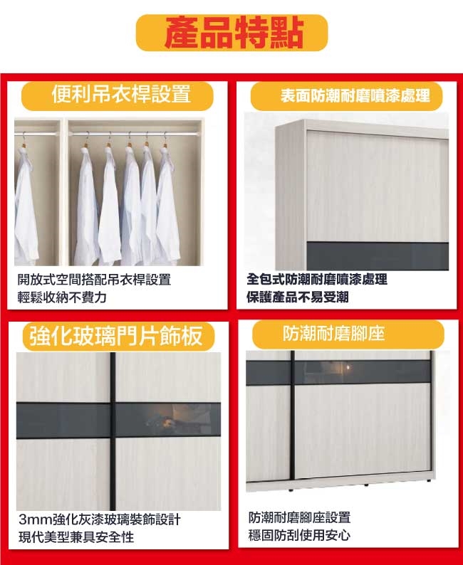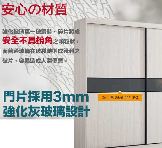 採用防蛀木心板+防潮耐磨腳座+五金滑軌結構+5mm強化灰漆強化灰漆玻璃門片飾板等安心材質製造