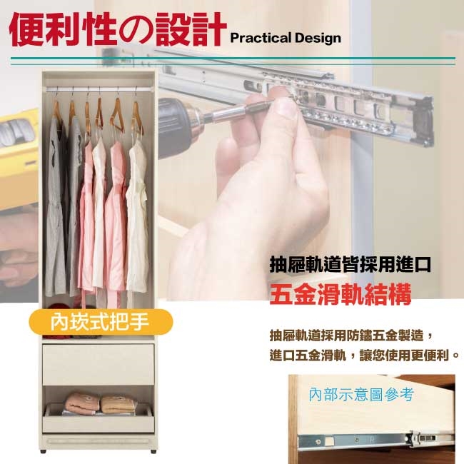 採用推門櫃+吊衣桿+二抽屜+拉盤層架+內開放層格等收納空間設計