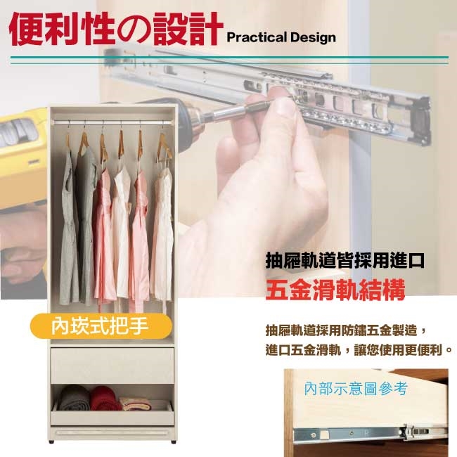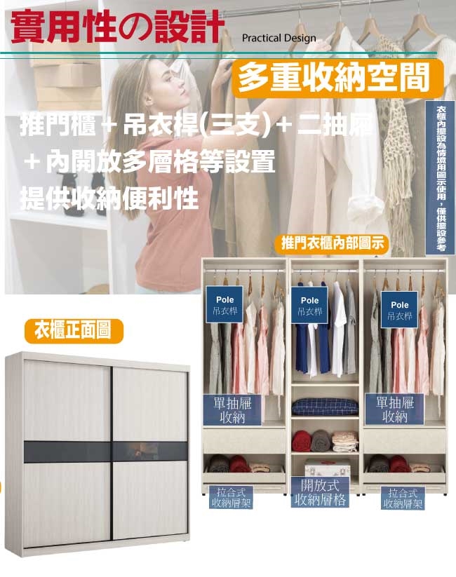採用推門櫃+吊衣桿+二抽屜+拉盤層架+內開放層格等收納空間設計