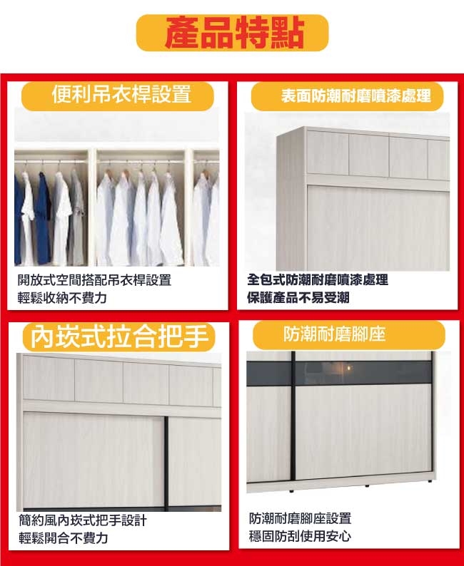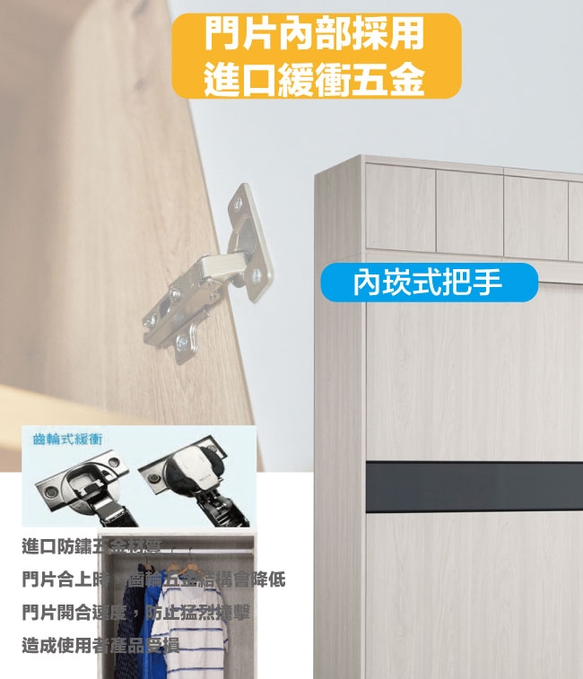 【文創集】摩克7.5尺單抽拉盤五吊桿推&開門加高衣櫃/收納櫃組合 淺橡木紋色系+現代簡約風格+安心材質製造,整體採用防蛀木心板+防潮耐磨腳座+五金滑軌結構+5mm強化灰漆強化灰漆玻璃門片飾板+防夾手緩衝門片五金等安心材質製造,產品外層採用防潮耐磨噴漆處理搭配採用下層推門衣櫃+上層開門被櫥櫃+吊衣桿+單抽屜+拉合式層架+內開放層格等收納空間設計,全由專人配送到家,專業安心服務,替你省下更多時間!