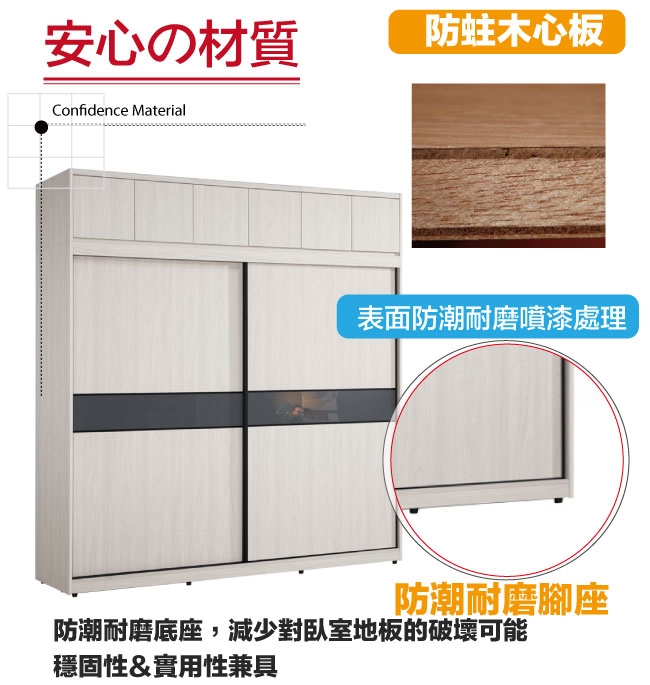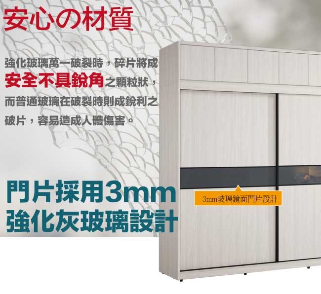 採用防蛀木心板+防潮耐磨腳座+五金滑軌結構+5mm強化灰漆強化灰漆玻璃門片飾板+防夾手緩衝門片五金等安心材質製造